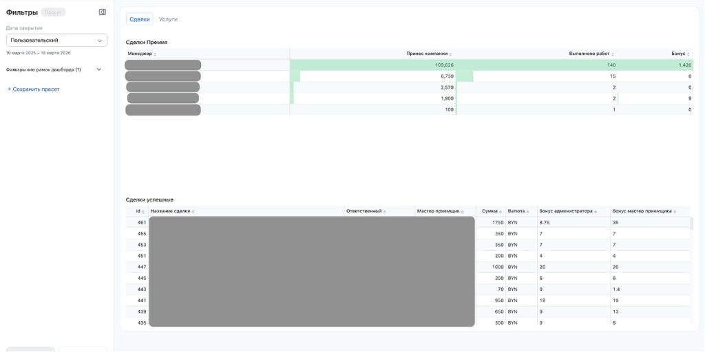 До внедрения CRM весь учет заказов и отчетности велся в Excel. У заказчика существовала сложная, многоуровневая система мотивации: оклад, бонусы за сделки, премии за выполнение задач и индивидуальные коэффициенты. Ежемесячный расчет зарплаты вручную занимал много времени и часто приводил к ошибкам.