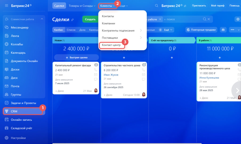 - Перейдите в раздел CRM → Клиенты → Контакт-центр.