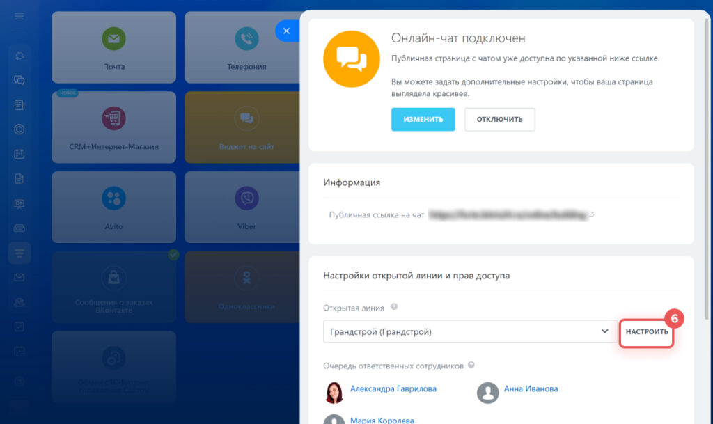 - Нажмите кнопку «Настроить» в блоке «Настройки открытой линии и прав доступа».