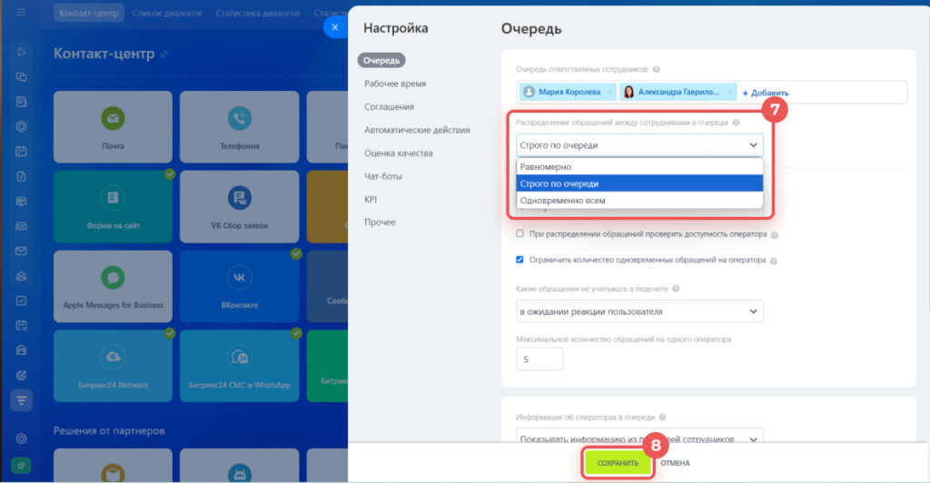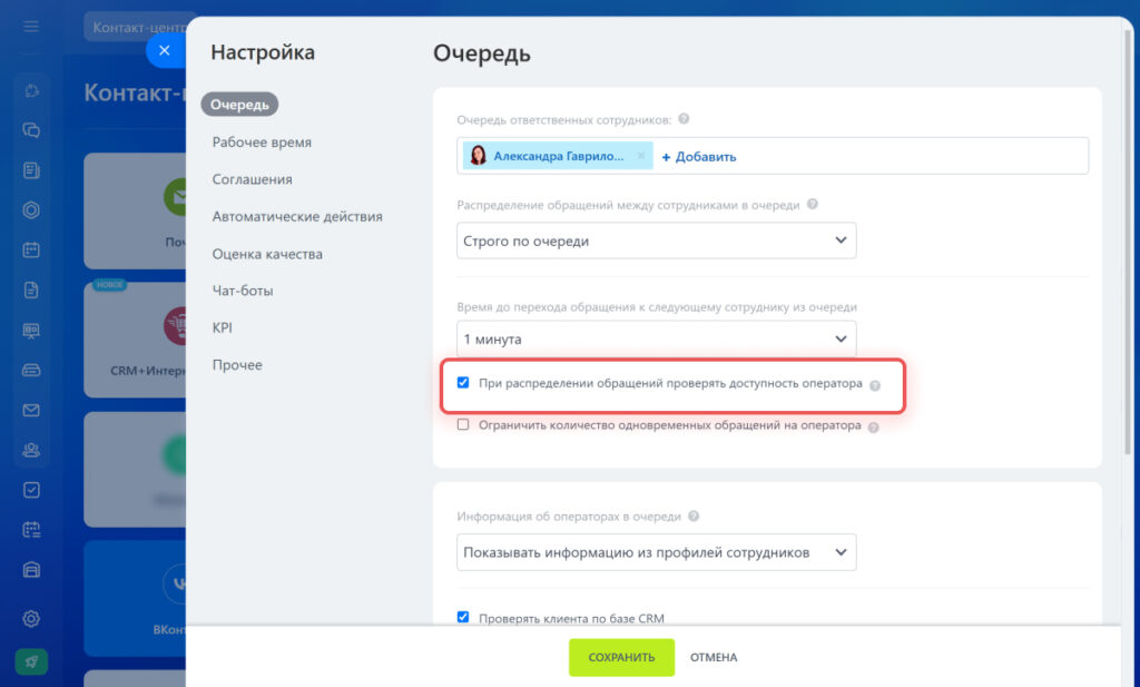 - Включите опцию «Ограничить количество одновременных обращений на оператора».