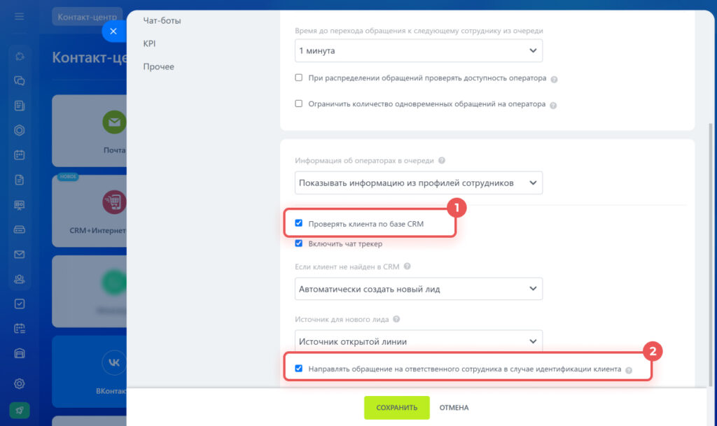 - Активируйте «Направлять обращение на ответственного сотрудника при идентификации клиента».
