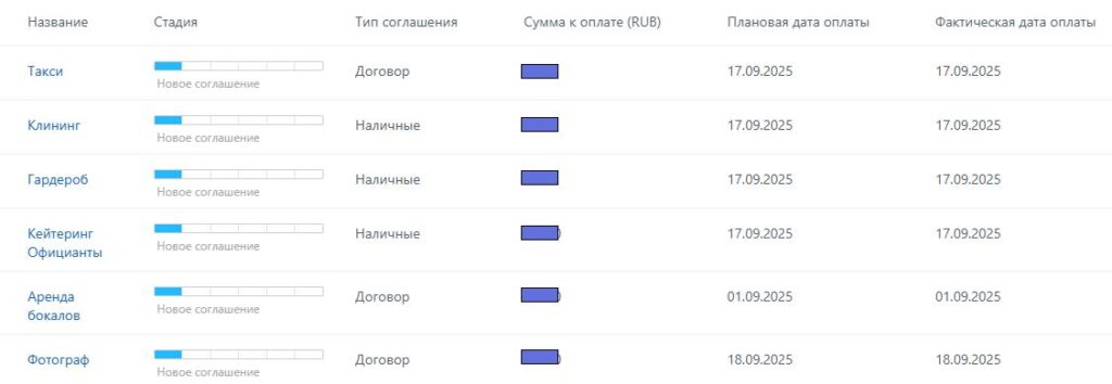 - Условия оплаты, суммы и статусы. Контроль ведется по каждому подрядчику раздельно, а затраты интегрируются с основной сделкой;