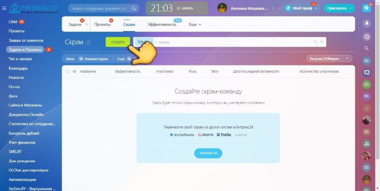 Каждый следующий тариф дает на 20 команд больше.Чтобы начать работу над проектом, нужно создать команду. Кликаем на Задачи и проекты > Скрам.