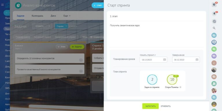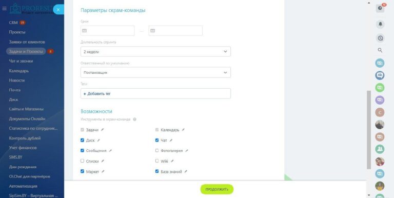 Кликнув на Расширенные настройки, можно установить длительность спринта, теги, ответственного сотрудника и инструменты, которые понадобятся Скрам-команде.