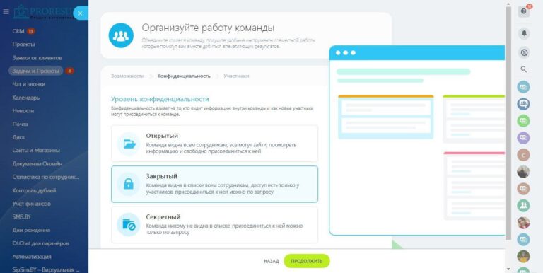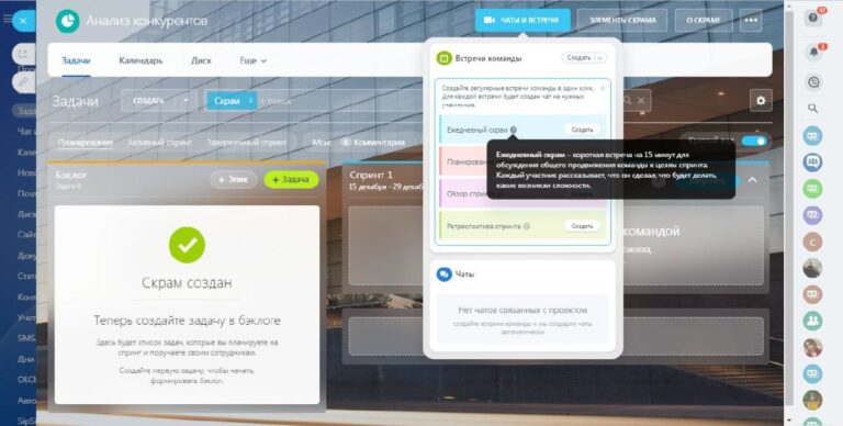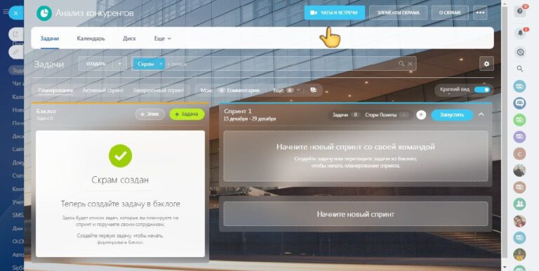 Изначально философия Скрам подразумевала живое общение. Но в Битрикс24 можно проводить виртуальные конференции и обсуждать задачи онлайн. Такой формат удобнее, ведь работать можно в любое время и не обязательно в офисе.