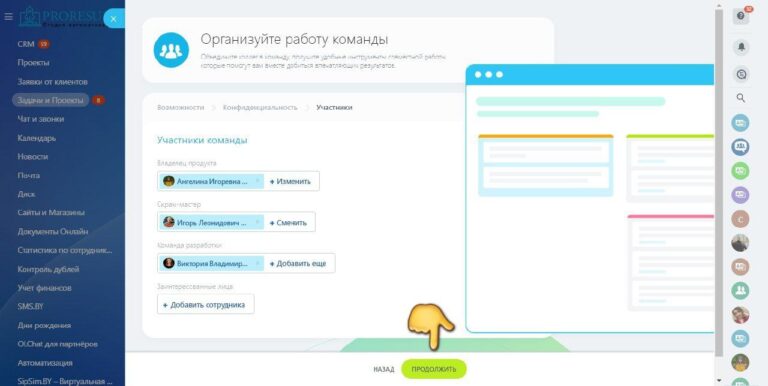 Функционал системы позволяет всем пользователям использовать Скрам для своих проектов. Так что руководитель может назначить на работу над спринтом как целый отдел, так и одного сотрудника.