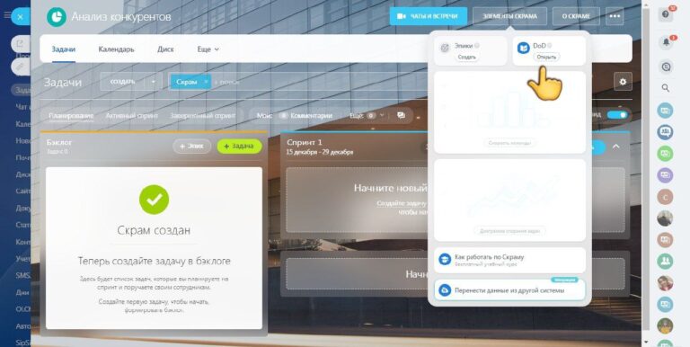 Можно нажать на DOD (Definition of Done), чтобы добавить чек-лист с критериями завершения спринта.