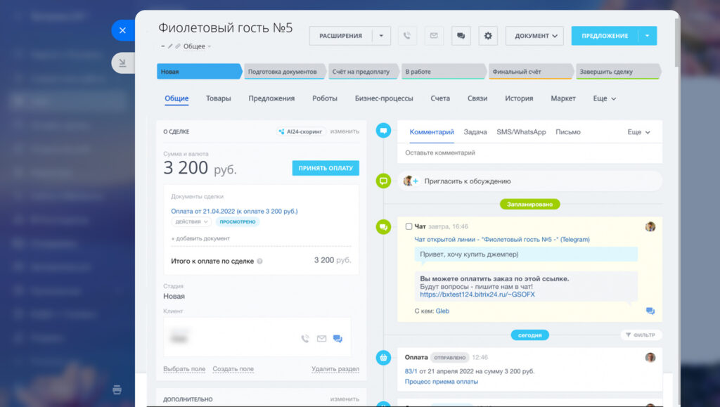 Все входящие сообщения из Telegram поступают напрямую в Битрикс24. При первом обращении клиента система создаёт контакт и, при необходимости, сделку. Вся переписка отображается в карточке клиента — любой сотрудник, подключённый к процессу, быстро вникает в контекст и продолжает диалог без потери времени.