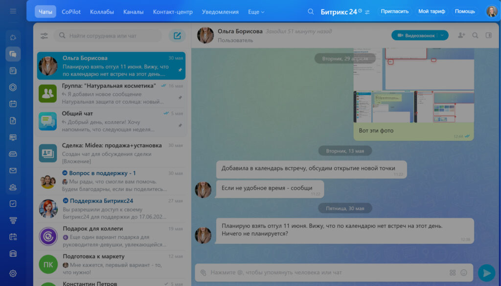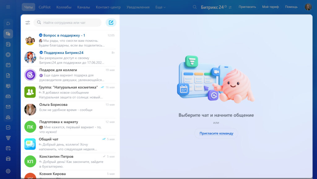 - Мессенджер — общение с коллегами, видеозвонки, групповые обсуждения, создание задач и встреч.