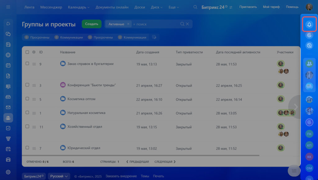Главное меню можно настраивать как под всю компанию, так и индивидуально. Панель инструментов сверху содержит функции управления текущим разделом, поиск, помощь и настройки. Боковая панель справа дает доступ к чатам и уведомлениям, а счетчики в интерфейсе помогают следить за важными событиями.