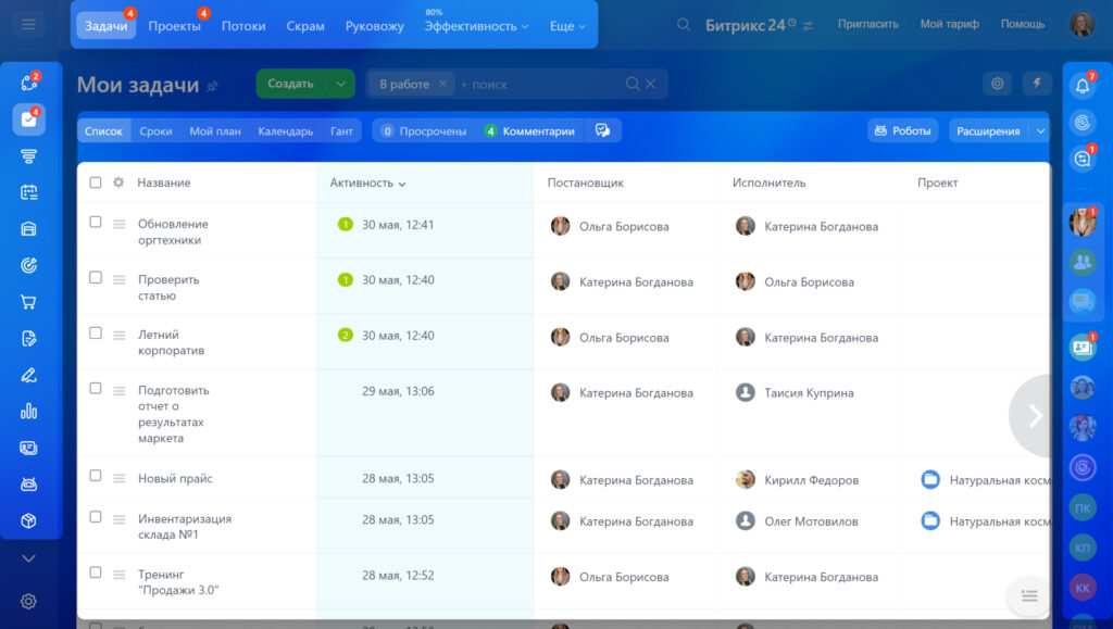 - Задачи и Проекты — контроль своих поручений, распределение задач между сотрудниками, отслеживание прогресса.