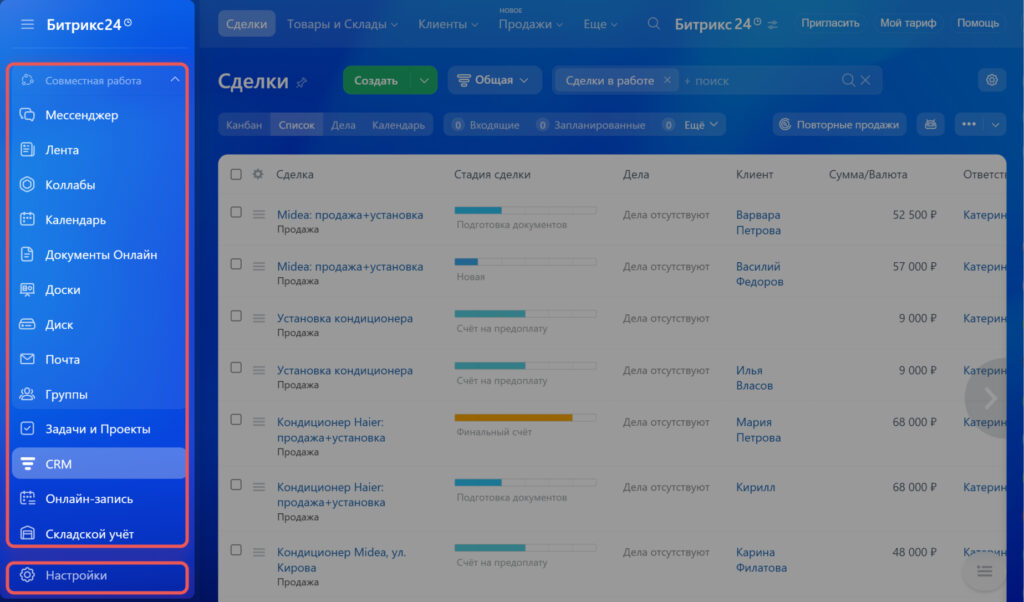 - Текущий раздел — позволяет переключаться между вкладками внутри активного модуля. Например, в CRM можно открыть Сделки, Каталог товаров, настроить права доступа.
